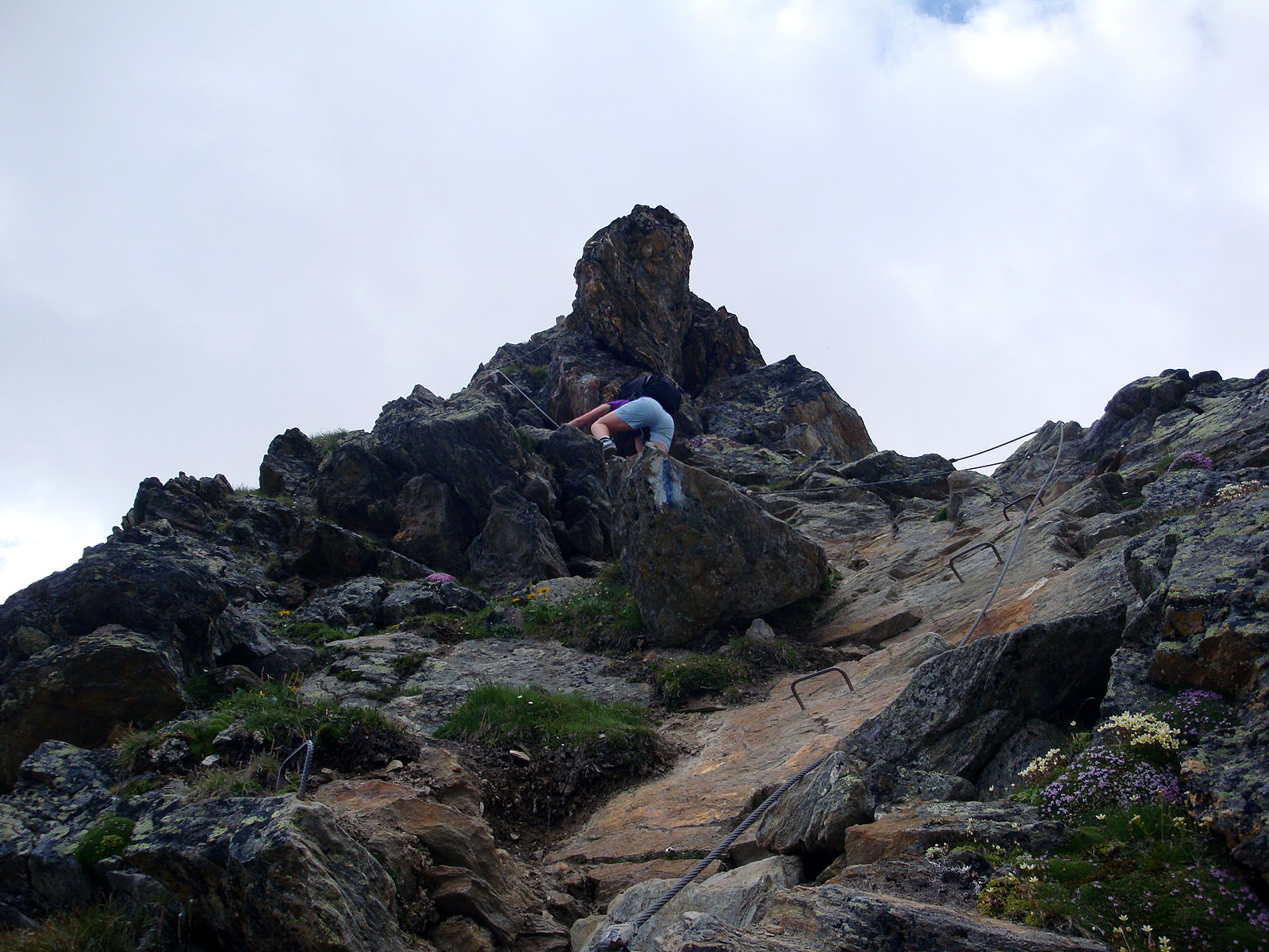 Der Wetterbericht verspricht für die nächsten Tage schönes Wetter, so dass wir heute mit der Bahn auf Hannig hoch gondeln. Bevor wir zum Hüttenaufstieg starten trinken wir auf der Gartenterrasse noch gemütlich einen Kaffee und eine Apfelschorle. Wir starten so gegen Mittag erst etwas bergab und später natürlich bergauf. Der Weg windet sich mit angenehmer Steigung bis etwa 2800 Meter hoch. Bevor nun das eigentliche Paradestück folgt, rasten wir kurz und essen eine Kleinigkeit. Gestärkt steigen wir den steilen und ausgesetzten alpinen Bergweg hoch. Dieser blauweiss markierte Weg ist nur für schwindelfreie und trittsichere Bergsteiger geeignet. Auch ein Hund hat hier nichts verloren. Es ist nicht ratsam mit einem Vierbeiner zur Hütte hoch zu steigen. Und ich möchte auch nicht bei schlechtem Wetter hier hochklettern. Ja es ist klettersteig ähnlich mit vielen Seilen und Haken versehen. Auch eine längere Leiter führt über eine Felswand hoch. Weil gerade ein paar Alpinisten auf dem Weg nach unten sind, müssen wir etwas warten. Man kann auf der Leiter nicht kreuzen.