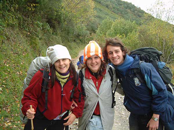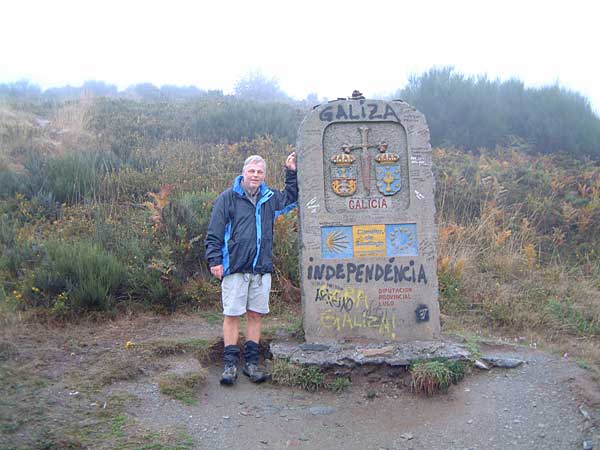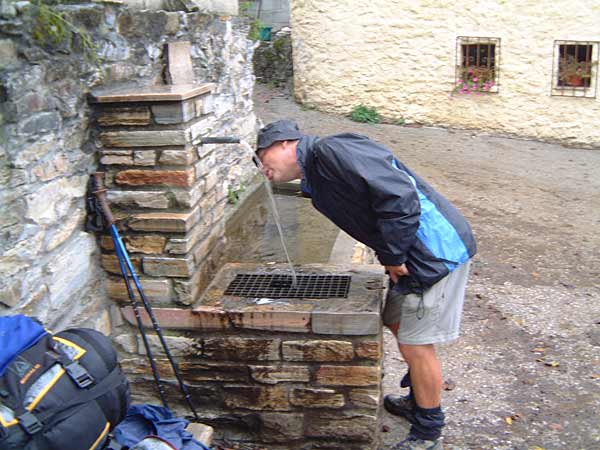 Beim Brasilianer gibt es ein gutes Frühstück. Liegt das an den vielen Deutschen hier? Erst um halb neun starten wir, Ewald und ich, auf die Etappe. Es dämmert bereits und der Weg führt vorerst noch weiter ins Tal. Aus dem wolkenverhangenen Himmel beginnt es zu regnen. Noch bevor der Pfad zu steigen beginnt, treffen wir wieder einmal das holländische Ehepaar mit dem Hund und den riesigen Rucksäcken, welchem ich schon in Frankreich begegnete. Übrigens, mit Ewald wandern geht super. Wir sind etwa gleich schnell und wollen auch etwa gleich weit. Nun steigt der matschige Weg steil hoch durch den Wald bis La Faba. Am Brunnen geniessen wir das frische Wasser. Weiter führt der Weg hoch Richtung O Cebreiro. Jetzt stehen wir beim Grenzstein zum lang ersehnten Galizien. Das Wetter ist trüb und nass, so wie man es hier eben erwartet. Schon bald erreichen wir nach 700 Höhenmetern O Cebreiro, der berühmte Ort am Jakobsweg auf über 1330 Metern. Im Restaurant bestellen wir eine Portion vom lokal hergestellten Käse und ein Glas Rotwein. Inzwischen betreten auch die Holländer das Lokal. Der Hund muss wie üblich draussen bleiben. Inzwischen ist auch der Gepäcktransport der deutschen Gesellschaft eingetroffen. Die werden wohl hier übernachten. Nun besichtigen wir noch die alte Steinkirche und das Strohdachhaus. Nachher wandern wir den Hügelzug entlang bis zur bekannten Pilgerstatue, die in vielen Büchern abgebildet ist, bei Alto San Roque. Es geht weiter durch das Dorf Hospital de Condesa, dann auf einem Pfad dem Hang entlang und dann zum dritten Mal steil hoch bis Alto do Poio. Kurz bevor wir die Höhe erreichen, ein Schreck fährt mir durch die Glieder. Ich stehe wie angewurzelt still. Eine etwa 50 cm lange Schlange schleicht unmittelbar vor meinen Füssen vorbei. Wahrscheinlich ist es eine Viper. Einen Schritt weiter und ich wäre direkt drauf gestanden. Vorsichtig bewege ich mich einen Schritt zurück. Vor Schreck vergesse ich eine Foto zu knipsen. Heute war meine erste Begegnung auf dem Weg mit einer Schlange. An vielen heissen und steinigen Gebieten habe ich immer aufgepasst. Aber heute, bei diesem feuchten und kühlen Wetter habe ich wirklich keine Schlange erwartet. Inzwischen regnet es nicht mehr und wir können von hier oben die Aussicht geniessen. Nun wandern wir weiter bis Fonfria, ein richtiges Bauernkaff mit entsprechend schmutzigen und matschigen Wegen. Nach einem Trinkhalt führt der Weg lange bergab. Wir überholen zwei Mädchen und ein Junge aus Uruguay. Die drei sind unterwegs von Ponferrada bis Santiago. Bei heftigem und lästigen Gegenwind wandern wir weiter bergab bis nach Triacastela. Hier hat es mehrere Herbergen. Wir wählen die erste mit den Flügeltüren links auf der Wiese beim Dorfeingang. Diese Herberge ist wie in Galizien üblich gratis, das heisst man kann Spenden so viel man will. Sie wird vom Dorfpfarrer betreut. Er wirbt auch für die Pilgermesse von heute Abend. Inzwischen sind auch die jungen Urus eingetroffen. Ewald und ich beschliessen vor dem Nachtessen den Gottesdienst zu besuchen. Mit dem lässigen Pfarrer besammeln sich etwa zehn Pilger um den Altar. Die Atmosphäre ist locker und wir erzählen uns gegenseitig woher wir kommen und warum wir hier sind. Auch Joe treffen wir wieder. Er ist etwa 65 Jahre alt, in Madeira geboren und lebt seit 43 Jahren auf der Insel Bermudas. Wir nennen ihn einfach Bermudas Joe. Er ist bereits zum dritten Mal auf dem Jakobsweg. Zweimal startete er in St. Jean Pied de Port, dieses Jahr beim Somportpass und jedes Mal bis Santiago. Zu dritt gehen wir in ein feines Restaurant. Das Nachtessen mit einem Galizischen Wein schmeckt hervorragend. Weil Joe in einer anderen Herberge übernachtet, verabreden wir uns für morgen Abend in Fereiros.