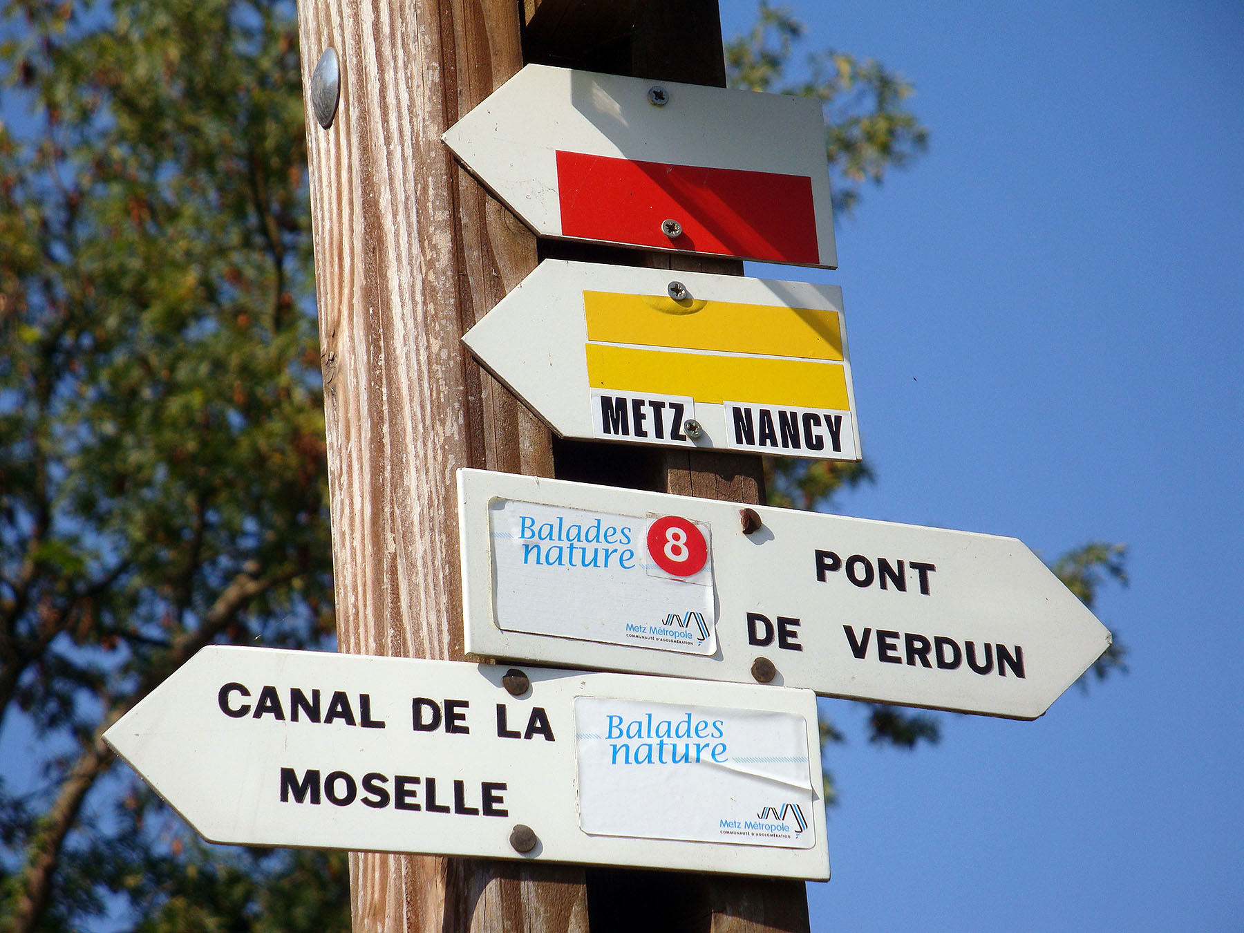 Nach kurzer Wanderung erreichen wir die Wallfahrtskirche Salette und eine halbe Stunde den Ort Mey. Der Weg ist hier und wie schon bei Perl/Apach sehr gut mit rot/weiss markiert. Über einen schönen Wiesenweg erreichen wir das markante Hochhaus. Nun führt der Weg durch den Vorort nach St. Julien-Les_Metz hinunter. Hier wandern wir bei der markanten Festung vorbei und auf dem Weg entlang des Kanals bis zur Kathedrale von Metz. Jetzt haben wir unser Ziel erreicht, zu Fuss vom Dom in Trier bis zur Kathedrale in Metz. Bravo Angelika!