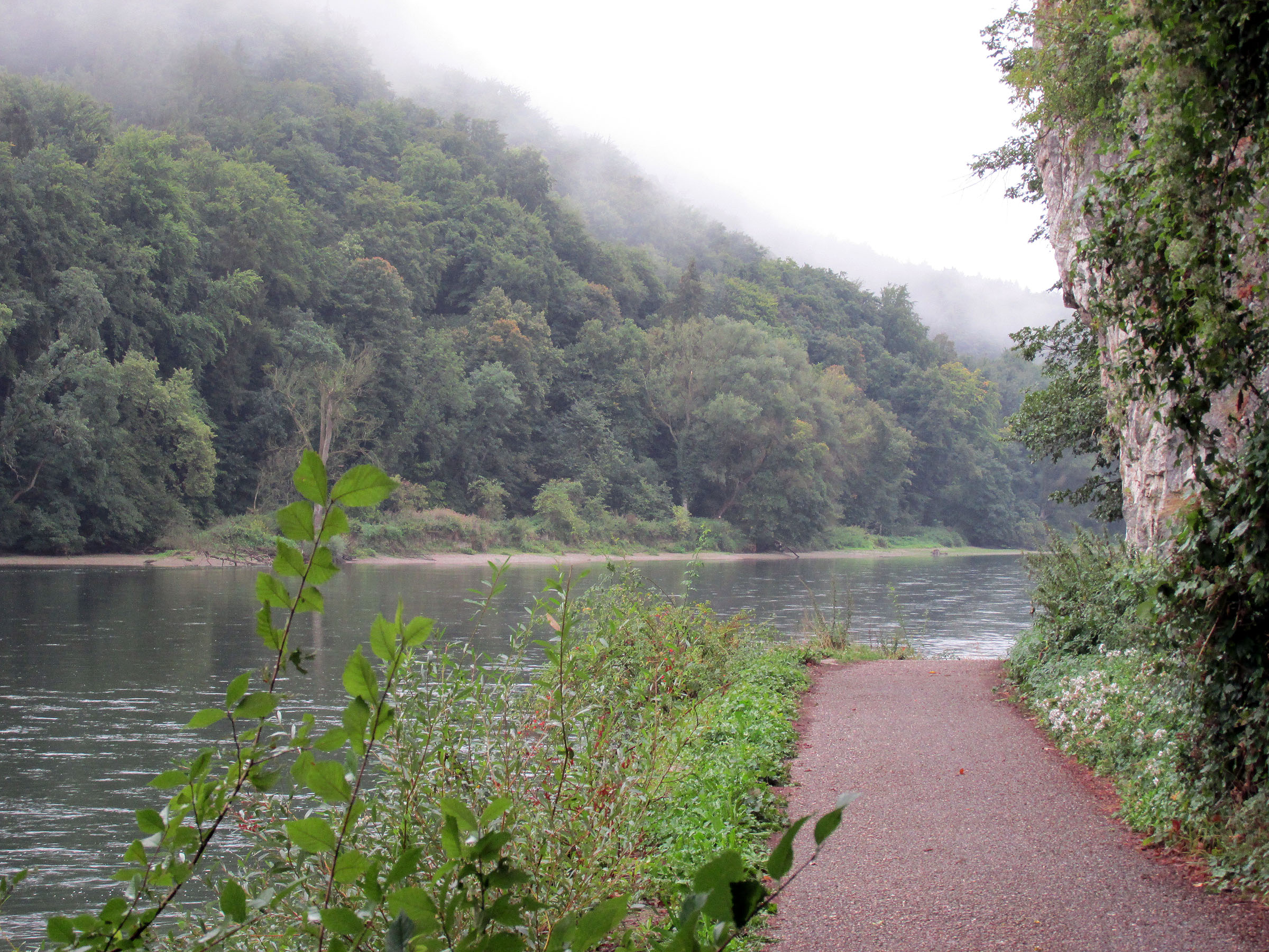 In der Bäckerei kaufe ich Picknick und starte auf die interessante Etappe. Ein schöner Weg führt zuerst durch ein enges Tal der Donau entlang. Nach gut fünf Kilometern erreiche ich das Kloster imposante Weltenburg, welches stolz gegenüber in einer Donauschlaufe thront. Es hat hier eine Fähre, aber leider sehe ich weit und breit kein Boot. Darum wandere ich weiter. Über einen Hügel auf einem romantischen, einsamen Waldweg erreiche ich nochmals das Donauufer. Bei etwa Kilometer 10 verlasse ich das Donautal endgültig und raste kurz auf einem Bänkli bei der Hadriansäule.