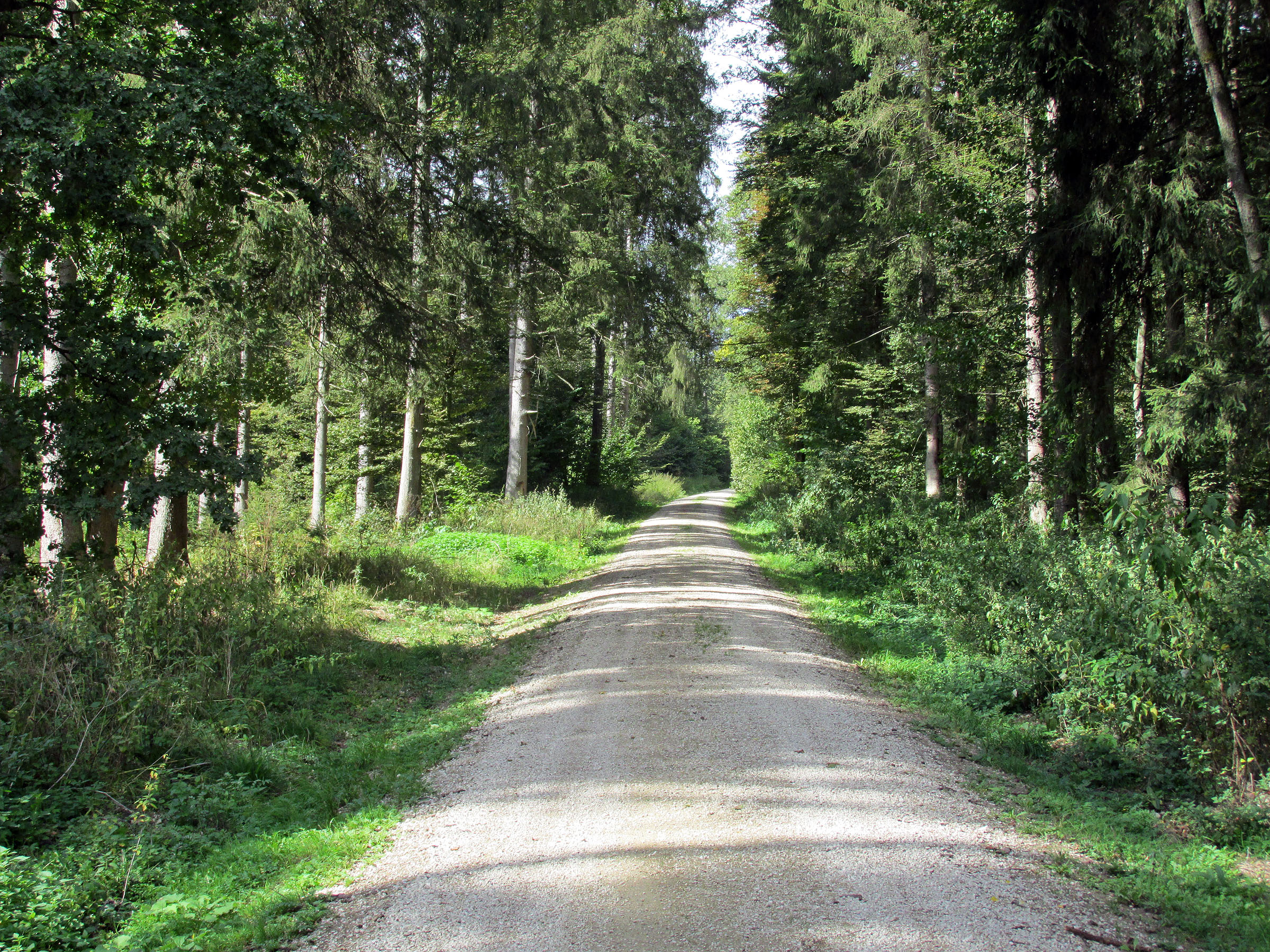 Ich durchwandere den Südzipfel mit ungefähr zehn Kilometer Länge. Unterbrochen wird dieses Waldstück nur durch die Waldlichtung mit dem Örtchen und der Wallfahrtskirche Bettbrunn. Ich komme zügig voranund erreiche kurz nach 13 Uhr bereits Stammham. Das Wetter ist ideal, wolkig mit wenig Sonne, etwa 20 Grad und trocken, perfekt! Nach Besuch der Kirche und einer kleinen Einkehr beim ehemaligen Gasthof Ortner, das jetzt eine Pizzeria ist, wandere ich meinem Ziel noch durch ein längeres Waldstück entlang. Der Schluss bildet eine mehrere Kilometer lange, schnur gerade Römerstrasse. Diese Etappe war zwar lang, aber nicht langweilig, weil es doch sehr viel Abwechslung hatte.