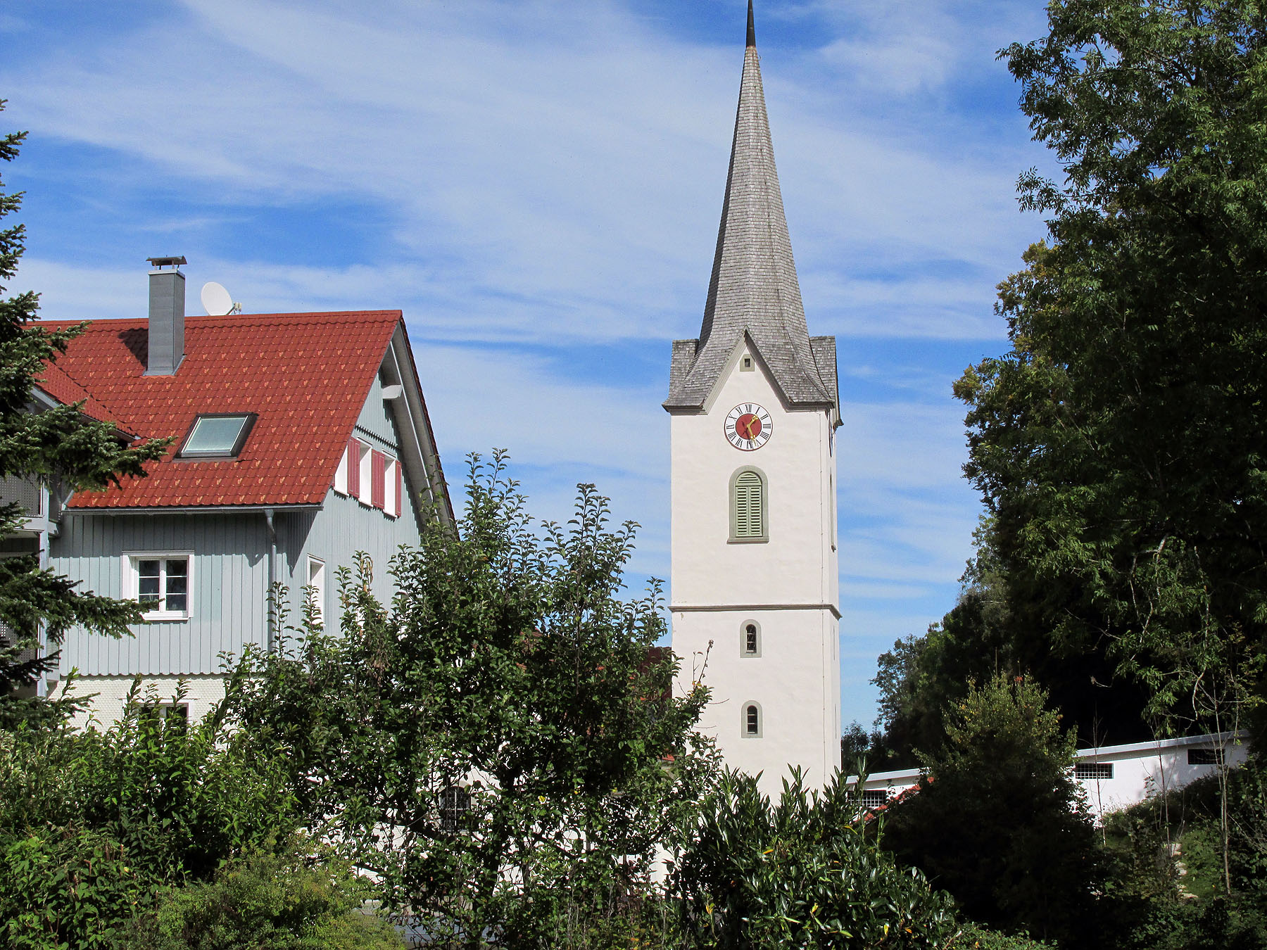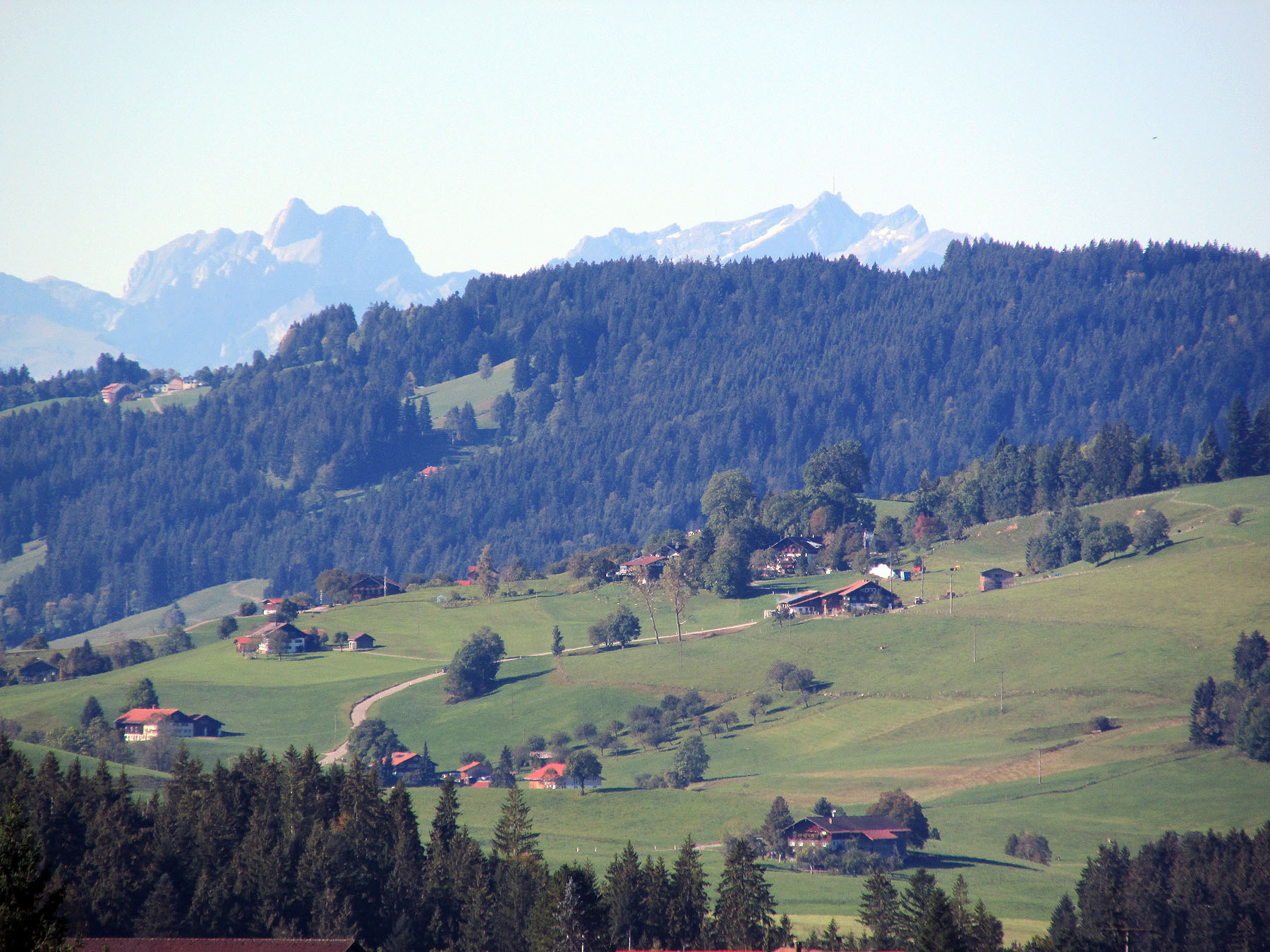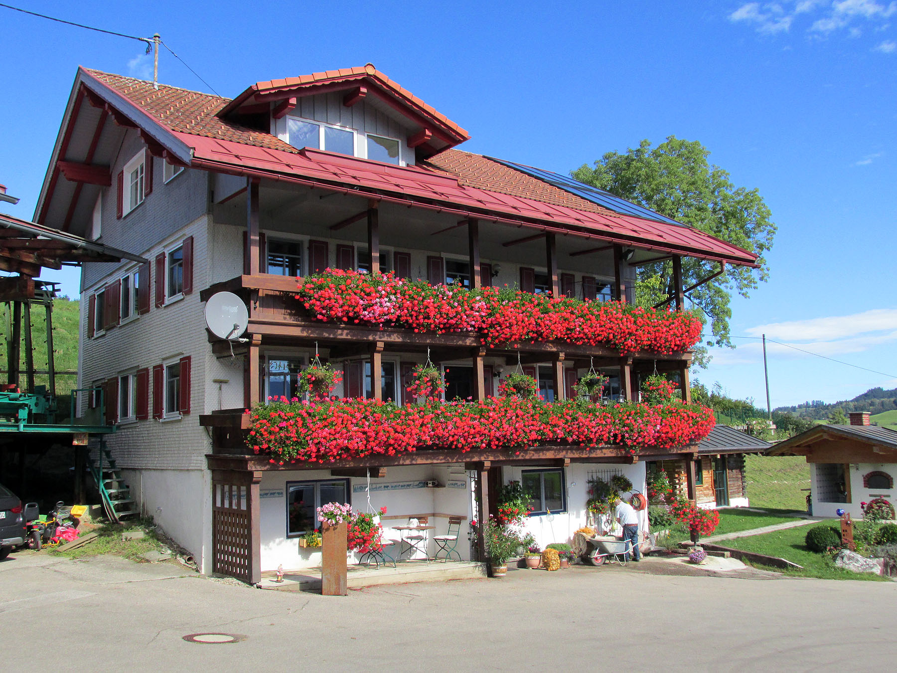 Leider sind es viele Asphaltstrassen. Und bei der brennenden Sonne komme ich recht ins Schwitzen. Ich wandere ohne Pause bis nach Genhofen. Nach kurzer Rast geht es weiter, immer auf und ab. Im Gegensatz zu gestern bei den wilden Kühen, passiert heute nichts Aussergewöhnliches. Auf dem Weg zwischen Simmerberg und Weiler wandere ich die gleiche Strecke wie vor acht Jahren. Aber ich kann mich gar nicht mehr erinnern. Es ist als wäre ich das erste Mal hier. Nach dem romantischen Abstieg erreiche ich Weiler, durchquere den Ort und nehme den Weg in Richtung Scheidegg. Vor acht Jahren wanderte ich mehr nördlich nach Lindenberg.