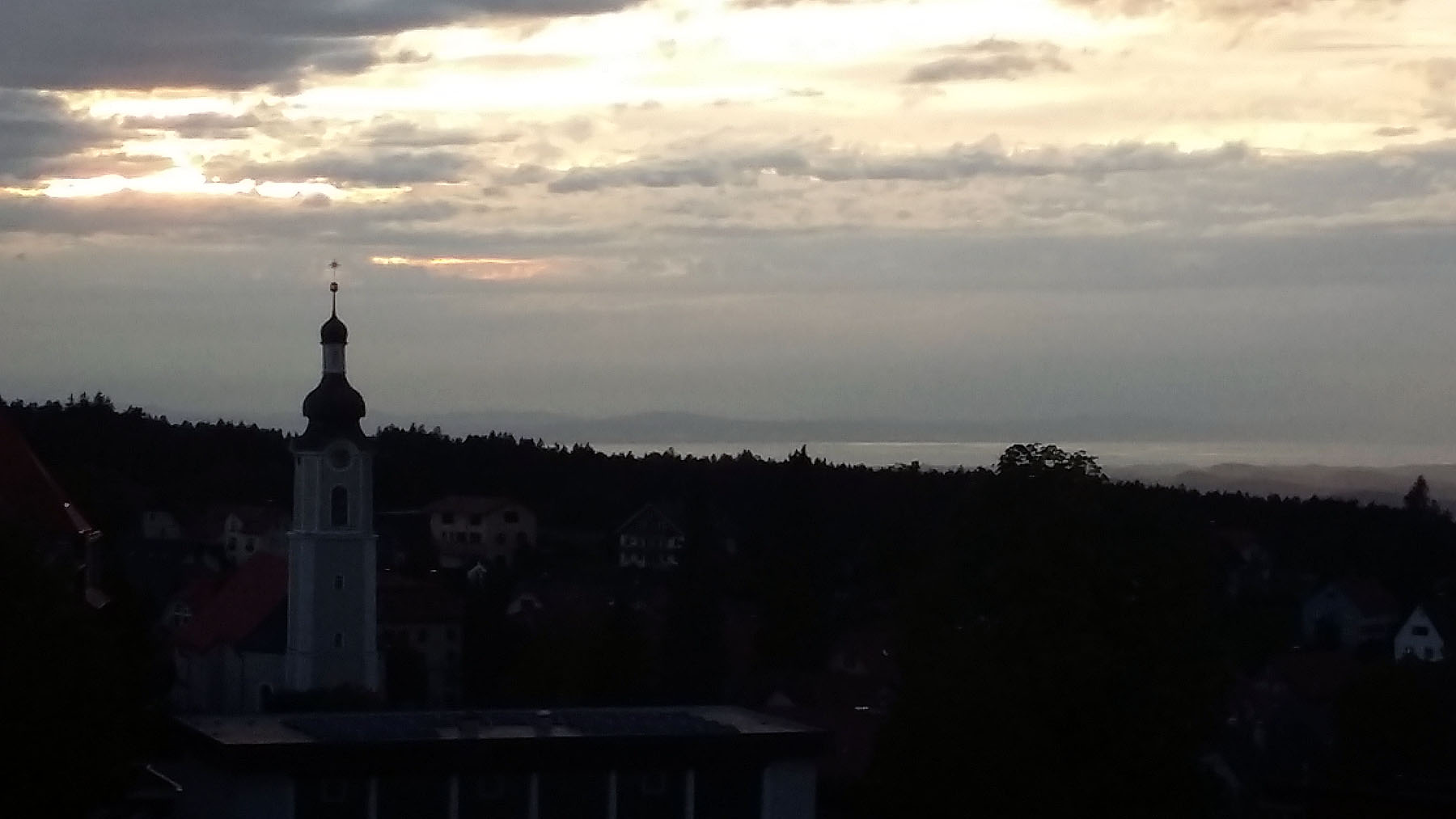 Nun erreichen wir Scheidegg und zwar zuerst das Kurviertel. Noch vor dem zentrum verabschiede ich mich von den drei Frauen, die hier in der Nähe ihr Hotel erreicht haben. Ich wandere weiter und frage im Touristenbüro nach dem Weg zur Pilgerherberge. Hier werde ich von Andrea sehr nett empfangen. Nach den Formalitäten und der Dusche geniesse ich auf der Gartenterrasse ein Bier. Nun habe ich aber Hunger und gehe etwas feines Essen. Leider sind die näheren beiden empfohlenen Restaurants geschlossen, so dass ich ins eher weit entfernte Restaurant Fünfländerblick spaziere. Hier geniesst man eine tolle Aussicht. Ich habe jedoch sehr viel Glück, dass ich hier noch einen Platz erhalte, denn die Gaststube ist sehr voll.