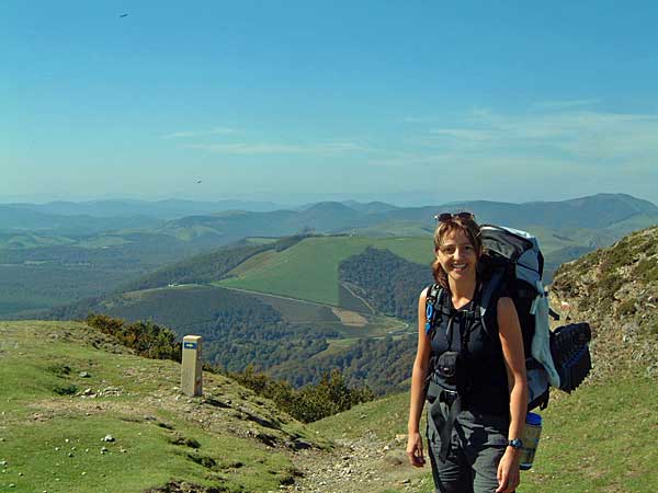 Nun starte ich etwa um 8 Uhr durch den feuchten Nebel die zuerst steil, dann nur noch leicht steigende Asphaltstrasse. Natürlich wähle ich die Route Napoléon über Hunto. Zügig wandere ich bergauf und überhole laufend vor mir gestartete Pilger. Da sieht man alles, Amerikaner mit riesigen Rucksäcken, mit Camping- und Trapperausrüstung, als gingen sie durch ganz Alaska oder Japaner mit kleinen Rucksäcken und je zwei grossen, baumelnden Plastiktüten. Nach etwa drei Stunden überhole ich sogar die Gruppe, die in Hunto gestartet ist. Nach gut 15 km verlässt der Jakobsweg die Asphaltstrasse und führt über einen kleinen Pass hoch. Der Nebel schwindet, stahlblauer Himmel und die Sonnen zeigen sich von ihrer schönsten Seite. Nun erreiche ich die spanische Grenze und betrete die Provinz Navarra. Ich bin in Spanien! Jetzt heisst es „buen camino“ statt „bonne route“ und „Hola“ statt „Bonjour“. Nach 1200 Höhenmeter Aufstieg, kurz vor dem höchsten Punkt auf etwa 1400 m picknicke ich auf einem Wiesenbord. Nach zehn Minuten setzt sich eine junge Kanadierin neben mich. Sie ist gestern von St. Jean bis Hunto die erste Etappe gewandert. Nach gemeinsamen Mittagessen wandern wir gemeinsam weiter. Ich bin früh dran und habe es nicht sehr eilig. Jetzt erreichen wir den höchsten Punkt Col de Lepoeder 1430 müM und werden mit einer traumhaften Aussicht auf Navarra belohnt. Bei der Abzweigung wähle ich als einzigen links den steilen Waldweg, die Kanadierin und alle anderen Pilger den weiteren Weg über Puerto de Ibañeta. Um 14 Uhr stehe ich plötzlich vor einem grossen Gebäude von Roncesvalles. Ein Hinweisschild zeigt, dass heute, aber erst um 16 Uhr, nur eine Unterkunft geöffnet ist, die Jugendherberge. Mein Rucksack steht nun als erster neben der Eingangstür. Die Wanderschuhe tausche ich gegen die Sandalen und gehe ein Bier trinken. Im oberen der beiden Restaurant reserviere ich mein Nachtessen für die erste Runde um 19 Uhr. Nach und nach treffen weitere Pilger ein. Auch die Kanadierin trifft nun mit ihren drei Kameraden ein. Sie übernachten und essen im unteren Hotel. Um 16 Uhr stehen etwa 40 Rucksäcke vor der Unterkunft, als die Türen sich öffnen. Pünktlich um 19 Uhr erhalten wir Einlass im Restaurant. Das erste spanische Nachtessen, ein Pilgermenü für 7 Euro, auf meinem Trip. Nach einem einfachen Salat bekommen wir einen frittierten Fisch mit Pommes und eine Stängelglacé. Pro Vierer-Tisch ist eine Flasche Wein, Navarra inbegriffen. Bei diesem etwas spärlichen Essen sehne ich mich an die kulinarische Zeit in Frankreich zurück! Auch nach 20 Uhr (!) treffen immer noch übermüdete, ja eher überforderte Pilger ein!