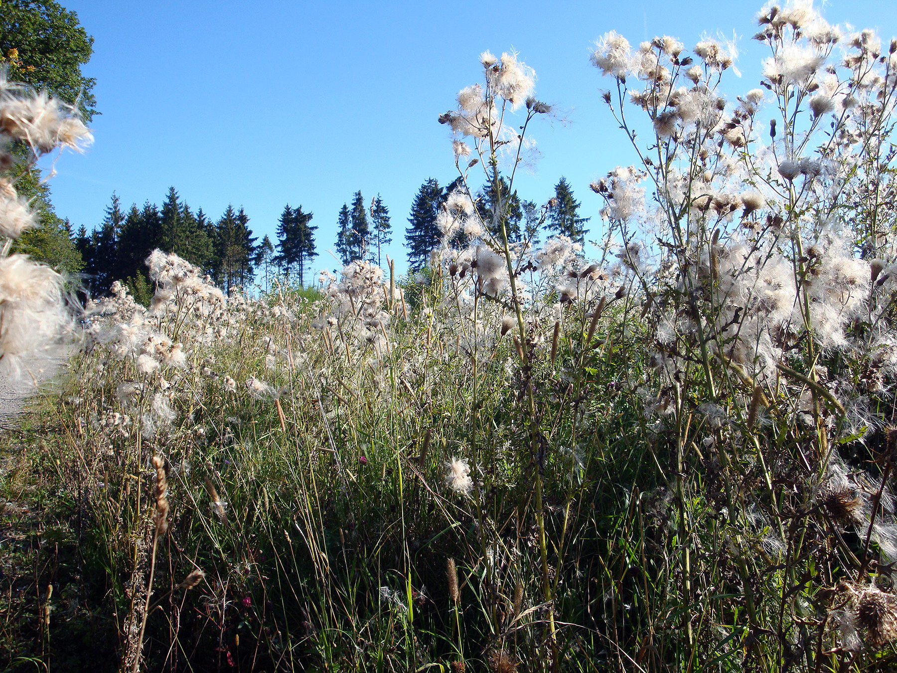 Nun wandere ich auf sehr schönen und abwechslungsreichen Wegen auf die bis jetzt wohl beste Jakobsweg Etappe. Der Himmel ist blau und die Sonne scheint, Traumwetter. Ich geniesse es richtig durch die wohlriechenden Wälder und die frisch gemähten Wiesen zu pilgern. Leider stimmen meine GPS Daten nicht überall mit der Ausschilderung überein, teilweise folgen sie der weniger attraktiven Fahrradvariante. Ich muss also höllisch aufpassen.